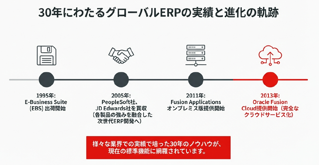 オラクルのERPの歴史は古く、1995年に「E-Business Suite(EBS)」が出荷されたことから始まります。その後、2005年にはPeopleSoft社やJD Edwards社を買収し、各製品の強みを取り込んだ次世代ERPを開発しました。2011年にオンプレミス版が提供され、2013年にはクラウドサービスである「Oracle Fusion Cloud」としての提供が開始されました。