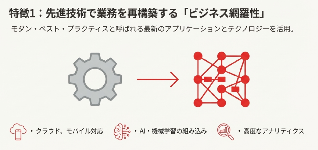 1つ目の特徴は、「モダン・ベスト・プラクティス」と呼ばれる、最適化されたビジネスプロセスが組み込まれている点です。
