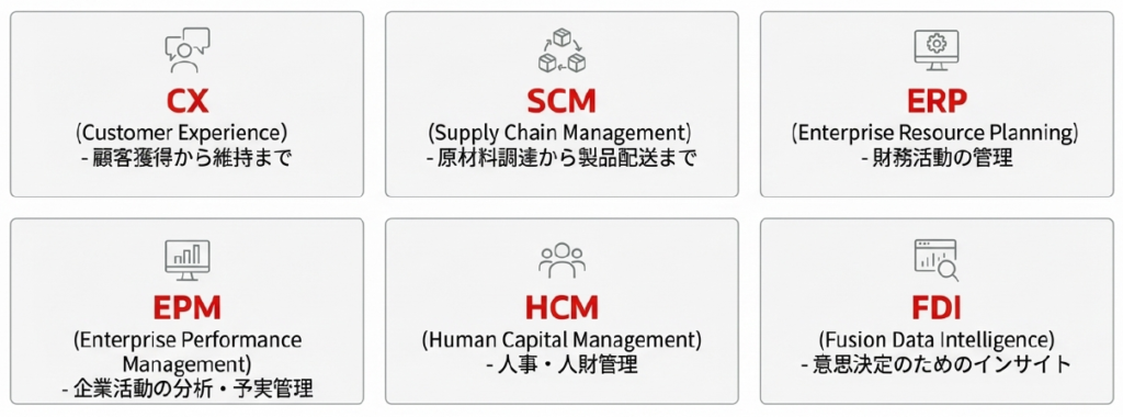 また、Oracle Fusion Cloudはデータベースからアプリケーション層まで統一された基盤(Oracle Cloud Infrastructure)上で展開されており、以下のような製品群がシームレスに連携します。