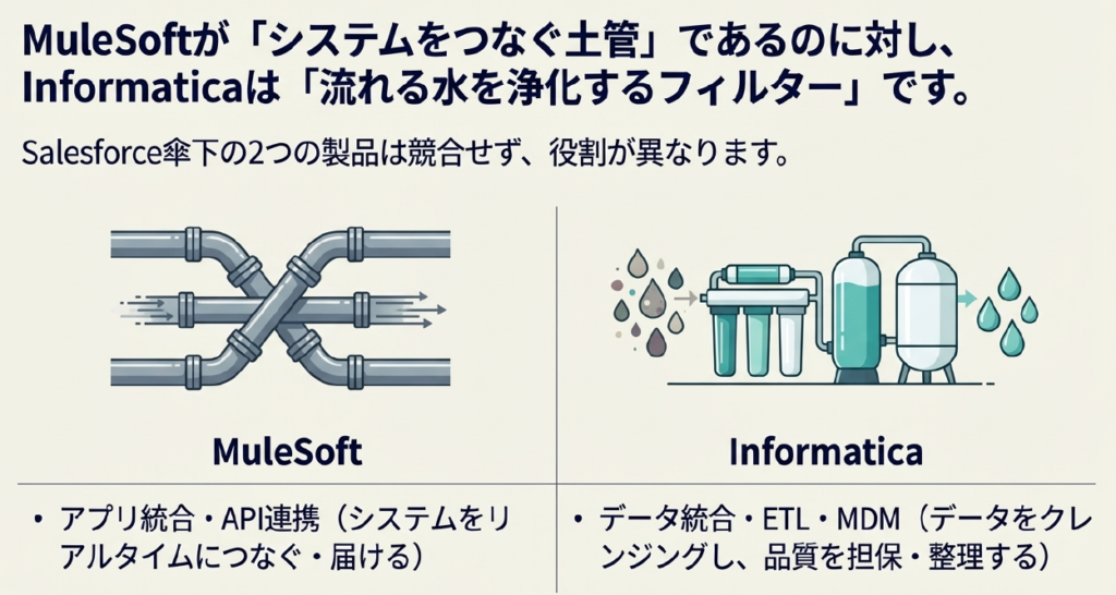 では、高品質なデータをどのようにAIへ届けるのでしょうか。ここで鍵となるのが、MuleSoftとInformaticaの連携です。これら2つの製品は競合するものではなく、明確に異なる役割を持っています。