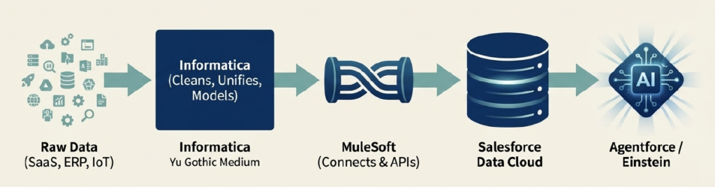 この構成から見えてくるSalesforceの最終目標は、単なるCRM企業からの脱却です。「Data Cloud」「MuleSoft」「Informatica」という強力な3本柱を揃えることで、「AI時代の最強データプラットフォーム企業」への進化を目指しているといえると思います。これは、企業のあらゆるデータを一手に握り、次世代データ覇権戦争を勝ち抜くための強力な布石だと言えます。